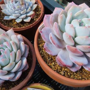 大きくなってきたラウリンゼ(右)とソンヨウン(左)。上からぱっと見るとよく似ていて区別がつかない。どちらも触ると白い粉が剥がれるので植え替え時は気を使う。
