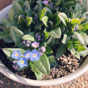 この前お迎えした苗で寄せ植えを作りました。😅 センスない出来栄え🤣 ミオソティス(忘れな草)はお一人様にする予定です。🪴 新しく苗をお迎えしたら植え替えします。 雨が上がって気温上昇14℃予報ですが 10m越えの強風になってきました。💨