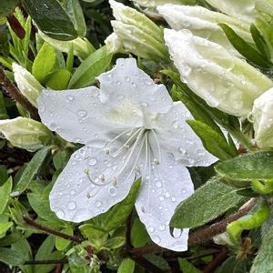 こんにちは😃 一日中雨降り☔の寒い日ですが 白いツツジさんが庭でひっそり咲き始めました🤍 暖かくなったら花が一気に咲きそうです😊🎶🎶 2枚目には取らずに放ったらかしていたヒョロヒョロのアスパラちゃんがツツジの花の後方に写り込んでいました😅