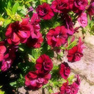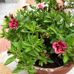 みなさんの投稿で気になっていたカリブラコアティフォシーダブルシリーズ。 か、かわいい‼︎‼︎😍確か、no.62とno.75だったかな?2色を寄せ植えにしてみました😊カリブラコアを育てるのは初めてです💕 もうだいぶ前に見つけてお迎えしていたのですが、蕾がたくさん〜っと思って買ったら、よく見たら全部花がら…😱 ここまで咲き揃うのにだいぶ時間がかかりました😅 それにしても暑い…🥵家の中の温度計は28℃超えです💦庭仕事できない〜💦