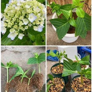 約一ヶ月経過したので鉢上げ🎵 4本全て発根してました❗️ 今回挿し木に使った土は『芝の目土』です。 いつも赤玉土や鹿沼土では水管理が下手すぎて失敗していて、挿し木用の土じゃないと成功しないのに用意が無く😭(急にいただいた為) 結果、庭にあった芝の目土の余りで挿し木。 画像のともう一種類のアジサイです😊 安定のどれがどれだかわかりません😅