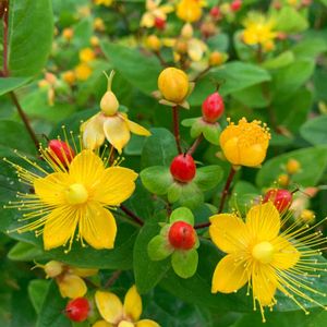2019.7.11撮影 今日のお花✿ヒペリカム(オトギリソウ) 黄色いお花が咲いた後は真っ赤な可愛い実をつけます☺️ 挿し木で増えます。(増えすぎる) 我が家のヒペリカムは切り花を頂いたもので、数年でワサワサと増えてくれました☺️ ドライフラワーにすると黒くなりますが良いアクセントにも👍