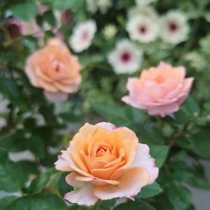 本日2枚目です ビオラの種まきばかりの地味な絵柄が続いているので、自分の気分転換に🎶 ミニ薔薇カーナハニーゴールド🍯🌹 酷暑の中、健やかな葉っぱを展開して、お花もちょこちょこ咲かせてくれる優秀な薔薇さん✨アプリコットがかった好みのお色で咲いているので、ダイニングから見える特等席に移動🎶冬にはもっといい鉢に植え替えて差し上げなきゃだわ😁