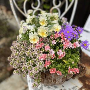 ①お気に入りの可愛い寄せ植え🥰 ②ハボタンが伸びたのでブラキカムに変えたら可愛いさ倍増😍 ブラスコは花が大きくて良いですね🤔 ③相変わらず可愛いイリスプリエール☺️