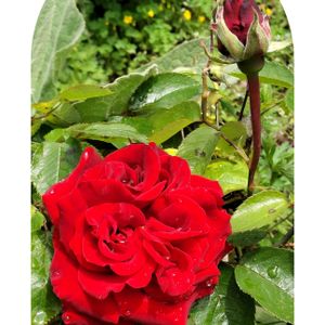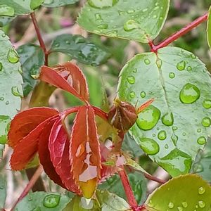 今日のお花バラ(赤)🌹 庭のバラはまだ固い蕾です 朝からの雨で葉に雨粒が付いてます☔