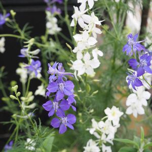 【飛燕草】《キンポウゲ科》 花言葉 「自由」「陽気」「活発」「軽快」 「快活」「自由気ままな暮らし」 別名 千鳥草 ラークスパー(意味:ひばりの蹴爪) 一重咲きは 5弁の花びらが付いているように 見えますが、 実はあれは 咢(ガク)の変化したもので、 本当の花弁は花の中央にあります。萼片の1枚が 後方に突起のように伸びる袋(距[きょ]といいます)を持ち、 特徴的な花の形をしています。
