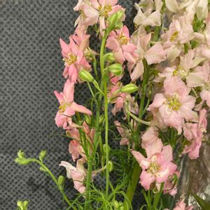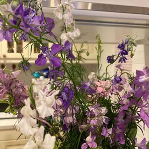 スターチスとヒエンソウ(ラークスパー) ? ヒエンソウが可愛くて見ていたら、もう弱っているみたいでお花屋さんにもらった 2-3日で枯れてしまうみたい ピンとたっていて綺麗 弱ってるように見えない、不思議 スターチス?と一緒に飾る