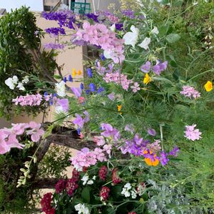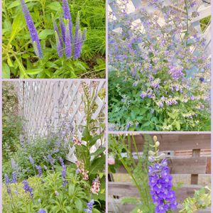 青〜紫の子達を集めました💜💙💜 左上ベロニカさん 地植えにして3年目? にしては勢いが無いです💦 右上はキャットミント(別名ネペタウォーカーズロウ) 物凄い生育旺盛で地を這うように倒れて他の植物に覆いかぶさるのでワイヤーで巻いて立たせてます😂 右下はラークスパー(別名千鳥草) この子も種まきから育ててます。 零れ種で増えるのですが、今年は零れ種であまり出て来てくれなかったです💦 左下はブルーサルビア 13〜14年植えっぱなし 右側にちょろんとバーバスカムサザンチャーム 奥にはキャットミント