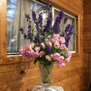 母の生けたバラとラークスパー 実はこの写真、以前投稿した八重ヒメヒマワリと同じ場所