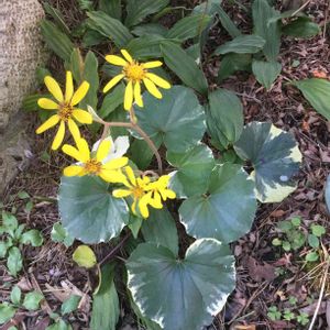 石蕗さん、ほぼ満開💕✨ この斑入りの葉っぱは浮雲錦という品種らしい。以前の投稿で教えていただきました (๑˃̵ᴗ˂̵)❤️ 後ろに見える葉っぱはエビネ、さらにその奥には蓮華升麻が種をつけています😌