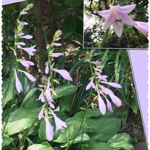 《ホスタ》 玄関前の庭にホスタ(ギボウシ)が綺麗に咲いています🍀…存在感のあるシェードガーデン向きの植物の代表格です🌱✨。 花は白色や紫色の花で綺麗ですが、花に勝るほどの葉色の綺麗さです。葉の斑の入り方・斑の色・葉の大きさなどに違いがあり個性豊かで、花の付いてない時期でも葉だけで大いに楽しめます😊💕💕。 とても水あげが良いので、切り花(葉?)に向いてます🤗。