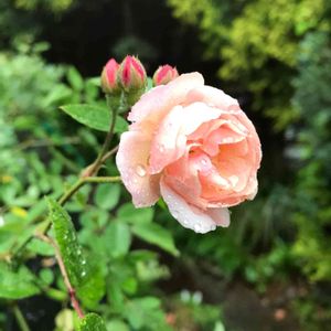 コ-ネリアの一番花は、 雨の洗礼 直径3cmの小さな花で、緑の濃い葉と蕾が可愛いバラです。