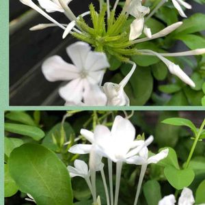 ルリマツリ (白) 終わった花茎をハサミで切って、✂️ 10日で、又蕾が上がってきました。 暴れるので、支柱で制御しました。