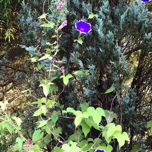 あら? 絞りの朝顔の種を蒔いたはず。 これはこれで愛でてあげましょう。 コニファーに絡んでいて、リビングから デッキ越しに見えます。 これに夕方、夜顔が加わるのはいつかな?