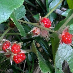 フユイチゴ バラ科 キイチゴ属 ツル性で地表を這うように伸びる 花期は9~10月 冬に果実が赤く熟します 赤い果実を1つ摘んで食べると熟していて酸味がなく甘くて美味しかったですヨ〜😄😋🎶
