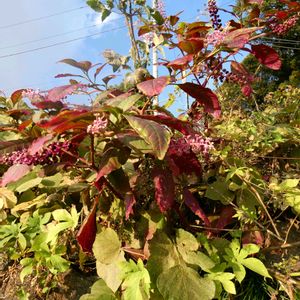 花後に花穂は果穂になり…黒紫紅色のブドウの様な液果がたくさんついていたヨウシュヤマゴボウの葉も赤く紅葉🍁していました😊 🏷金曜日の蕾たち 🏷山野草マニアに参加させて頂きます❣️