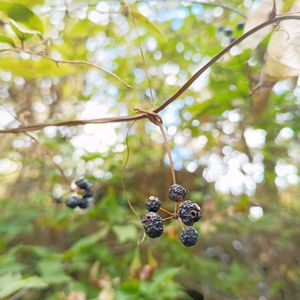 シオデ(牛尾菜)サルトリイバラ科シオデ属 地元の山に行くたびに目に付いた黒い果実を撮ってました。 山のあちこちになってた果実です。 1⃣ シオデの実 水分が抜けてちょっとシワシワ 11月6日 2⃣ シオデの黒い実 ツヤツヤです。 10月30日 3⃣ 緑の実 トゲがありません。 9月28日 4⃣ 緑の実 できたばかりの緑の実先が尖ってます。7月24日 5⃣ お花 (雄花) 7月12日 北海道〜九州の山野に生える。 茎はつる状に長く伸びる。 葉は互生し、長さ5〜15cmの卵状長楕円形で5〜7脈があり、やや厚くて光沢がある。 葉柄は長さ1〜2.5cmで、基部に托葉の変形した、巻ひげがあり、これで絡みつく。 葉腋から散形花序をだし、淡黄緑色の小さな花をつける。 雌雄異株。 雄花の花被片は長さ4〜5mmの披針形。葯は線形で鉤形に曲がる。 雌花の花被片は長楕円形でやや小さい。 花柱はほとんどなく、緑色の子房の上に3裂してそり返った柱頭がのっている。 液果は直径約1cmの球形で黒く熟す。