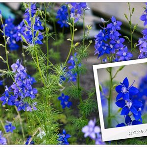 こぼれ種から塀と道路の隙間で芽を出して可愛く咲いてるチドリソウ💕 暑くても元気など根性チドリソウでした❣️