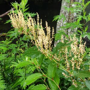 イタドリ タデ科ソバカズラ属 多年草 日本全土に分布 日当たりの良い山野や道端、土手などいたる所に群生する。 和名の由来は、傷薬として若葉を揉んでつけると、血が止まって痛みを和らげるのに役立つことから「傷み取り」が転訛してこの名が付いたと言われる。 別名はスカンポ、イタズリなど。 草丈は1.5mほど。 雌雄異株で、白か赤みを帯びた小さな花を多数つけた円錐花序を出す。 花被片は萼片5枚のみで花弁がない。 花期7〜10月 奥日光の湯ノ湖から湯滝に流れる所に咲いていました。