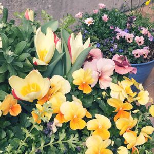 寄せ植えの中の、早咲きチューリップも 開き始めました🌷 手前のネモフィラは、お花はまだまだの ようで、少し残念😆 先日の花の祭典で買った苗と、おひとり様 だったビオラを合わせて寄せ植えしたので バックに入れました😊🌸