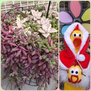 🏷️ネックレスの日 参加します😊💕 #ルビネ と #朧月 のコラボです🤭💕 マメダマハウスという雑貨&エアプラ&多肉のお店で飾られてて 色の対比が面白い😳💕 うちでもできる組み合わせ😳💕 とパクらせて頂きました😌💕 秋に長くなったルビネを チョンパし、剥げた所にチョイチョイ挿した子も根付いて、根付いた証拠で緑色に✨ 3色で素敵😍💕 そして…… チキンポシェットを奪い 二人羽織で楽しむチキン…… (ーдー)💨💨