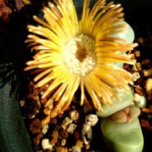 アルギロデルマ属 金鈴。 まるで太陽のような花が咲いていた🌻 リトープスみたいな模様はないけど、スベスベ・ツルツルの質感が陶器を思わせるね💖