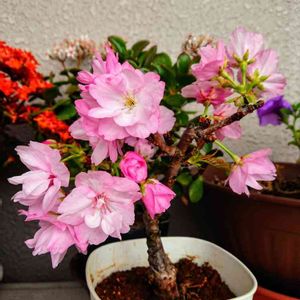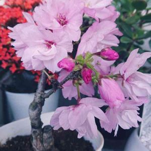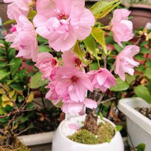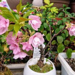 桜盆栽🌸「旭山」は濃いピンクの蕾が開いてきました(´˘` )♪