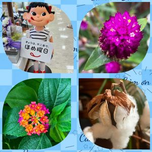 ◉ランタナ クマツヅラ科 ○カマラ 花色が変化する 事から七変化の名がある ◉センニチコウ ヒユ科 カラフルな苞の中に 小さな白〜クリーム色の 花が見えます ◉ワタ 〜今日のお花〜 アオイ科 多年草 果実が割れ、中から コットンボールが見える 姿が人気があります ☆ペコちゃん祭りに 参加します❣️