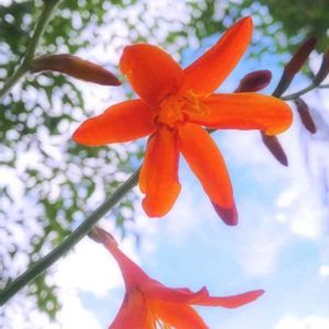 《緋色山慈姑》Hippeastrum rutilum 山慈姑とは、甘菜のことだそう。でも、甘菜よりずっと大きな花でした🧡緋色って、黄色みがかった鮮やかな赤色だそうで…英語でスカーレットだから、もっと深い紅かと思ってました❣️😅茜の根で染めた赤が、緋色なんだって ※調べたら、山慈姑=曼珠沙華の異名でもあるそうです