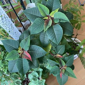 我が家に来て1年🪴 夏を越したポインセチアさんです。 ちょっとだけ赤みが出てきました♪ ここは日中は日当たりが良く、夜は灯りが点かず真っ暗な場所です◡̈⃝︎⋆︎* 使わない部屋活用☺︎。.:*ฺ✤ฺ