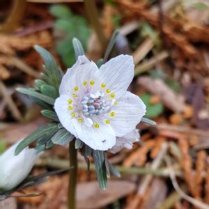 セツブンソウの自生地に来ています。今年は余り咲いておらず、花も雪のせいか傷んでいるものがあります。