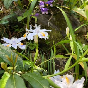 もう一枚シャガのpicを 石垣にこれまた咲いているラショウモンカズラとの2ショット 可愛い♡