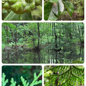雨降るこんぶくろ池自然博物公園 池の周りにあるコブシが果実に 葉の裏の気孔群がY字状になっているのねヒノキ?かな
