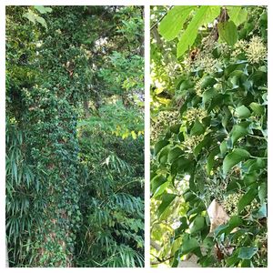 今日のお花アイビー キヅタ 木を覆っているキヅタ 上を見ると 花が咲いている10月