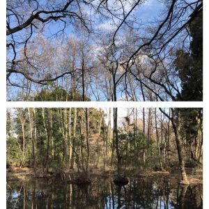 左 ハンノキ 右 コブシ こんぶくろ池 上手い具合に上下繋がりました 柏市の自然博物公園 東京ドーム4個分 森と湧水からなる公園 今はボランティアさんにより手入れされていて植物少ないかな 初めてここでキンラン見ました