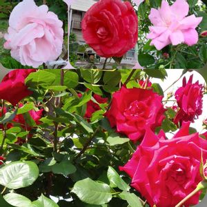 つるバラ🌹 6号苗が約1年でこんな状態になりました✨😭去年の夏から葉っぱがどんどん枯れて心配してましたが、ここまで復活しました!剪定しなくて良かったー✂️🤭🤭 左から ピエールドゥロンサール スイートドリーム ニュードーン マダムピエールオジェ スイートドリームが一番最初に咲きました🌹✨コーラルピンクが可愛い 背丈は155cmくらいかな
