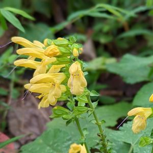 キバナアキギリ 学名「Salvia nipponica」 シソ科アキギリ属 📝紫の蛇の舌のような雌しべ。 2本の雄しべに葯がついていて、付け根に仮雄しべがある。 虫が蜜を求めて潜り込むと、仮雄しべが押されて本物の雄しべの先が下がり、虫の背中に花粉をつける。 背中に付いた花粉が雌しべに触れるしくみ。