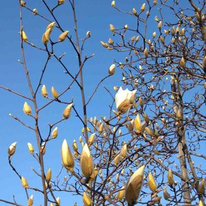 ハクモクレンでしょうか バス停のそばのお宅の木 よく似たコブシは花びら6枚、ハクモクレンは9枚と教わった記憶が