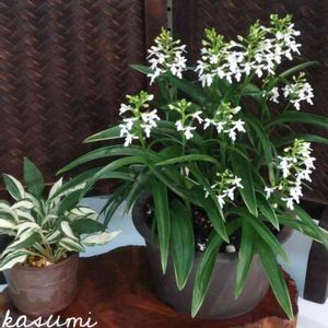 野生ランのサツマチドリ。 ウチョウランの変種とされる小型野生ラン。 鹿児島県の下甑島にのみ固有し、日差しの照り付ける海に面した切り立った岩壁に自生するとされる逞ましいランです。 基本種のウチョウランに比べると全体的に大柄で、照りのある太くしっかりとした葉茎から多数の花を咲かせる雄大な姿が魅力ですね。 何と言うか、ウチョウランの外装強化バージョンといった感じでしょうか。 距が短く花に細かい斑点模様が見られのが大きな特徴ですが野生の個体には斑点模様が無いものも多く、原種の中でも結構なバリエーションが見られますね。 南方系の変種ということで暑さに強く性質強健で、個人的には基本種のウチョウランよりも数段育て易いもののように感じております。