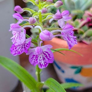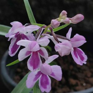 ウチョウランです。アワ(安房)チドリのはず?です😅。 自然大好き派😘、兼園芸もやっています派です😅。これも野鳥の会の先輩からのいただきものです。先輩の入手経路は未確認ですので、本当のアワチドリかは??です。このピンク系は年により若干色の出が異なるような気がします。この鉢は白2、ピンク1ですが球根では色が分からないので咲いて初めて組み合わせが分かります😅。