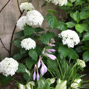 アジサイアナベルとホスタ ホスタの花が咲き出しました。 アナベルの白と合いますが、外壁塗り直ししなきゃ😅