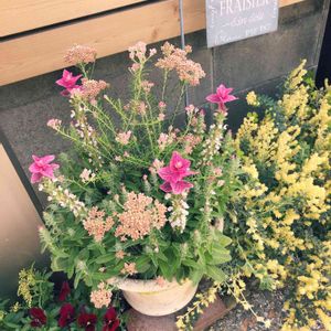 春の寄せ植えです。色違いのライスフラワーを使ってピンクのグラデーションです。