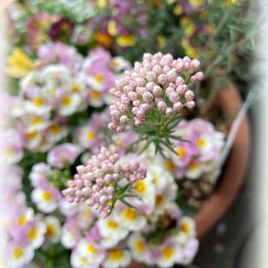 今庭🎶 真ん中ツブツブはライスフラワー ローダンセマムレトロクラッカー アルメリア・バレリーナスカーレット などなど、、、 ビオラを切り戻しした(⁎˃ᴗ˂⁎)