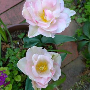 🍀🌷チューリップ🌷🍀 ①今は薄いピンクですが、咲き始めはクリーム色④でした〜🤗🎶🎵 毎日楽しめましたよ。 名札📛無くしたのでお名前はわかりません。 ⑤別の鉢の八重咲きのチューリップ🌷 球根を植えた時にチドリソウの種をパラパラ蒔いたけど ほとんど発芽しませんでした〜😭😭😭😅💦 🏷5日はごっつご機嫌 に参加させて下さいね。