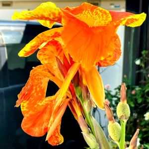 カンナの花 通り道のお宅の花壇に 今朝の早朝散歩で