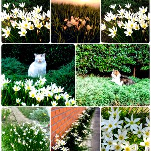 今日のお花 タマスダレ 散歩道で出会ったお花 ニャンコは花が無い時は上にいます。 リュウノヒゲも一緒に植えてありました。