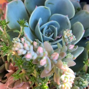 多肉寄せ植えの中の、、、好きな色💗 七福神で、🏷⸒⸒ど真ん中の日 ピンクのツボミは何の多肉ちゃんのお花なんでしょ❓( ˙꒳˙ )??? 🏷⸒⸒金曜日の蕾たち 参加させてくださいね〜(՞ . .՞)"𓈒 𓏸𓈒𓂂𓂃♡