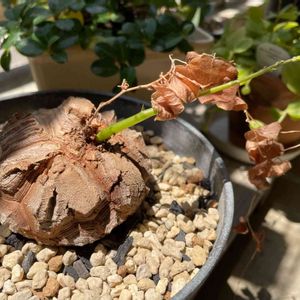 久しぶりに 亀甲竜さん登場┃д゚))ノ 実生半年程で 直径2~3㎝の ツルツルボディな子を お迎えしてから 1年ちょっと 経過しました(・∀・) イモを大きくするには 土に埋めた方がいい って事で 亀甲竜の魅力である イモの存在全く無視して 茎が出る程度まで 埋め付くしてたら 最近イモのひび割れが 良い感じ(〃∀〃)♡ 休眠期までもう少し📆 葉っぱの縁が 少し紅葉して来たけど まだまだモリモリの みどりの葉っぱ🌿 お日さま沢山浴びて 大きくなれよ٩₍๑>ω<๑₎۶