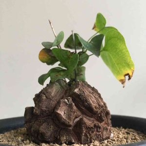 おやすみなさい。 また、夏の終わりに…。 【ディオスコレア・エレファンティペス】 (和名 : 亀甲竜) 和名のとおり、亀の甲羅のような形をした冬型塊根植物です。 夏も終わり涼しくなる頃に、塊根の頂点の付近からツルが勢いよくグングン伸びてきます。 伸びたツルには光沢のある濃い緑色のかわいいハート型の葉が出てきます。 科名 : ヤマイモ科 属名 : ディオスコレア属 学名:Dioscorea elephantipes 和名 : 亀甲竜 原産国:南アフリカ(南端部一帯) タイプ : 冬育生型
