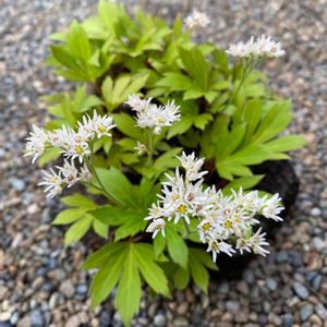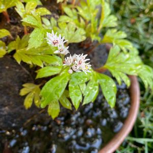 おはようございます。 庭の小葉丹頂草(コバタンチョウソウ)が咲き始めました。 岩八手(イワヤツデ)の仲間です。丹頂草(タンチョウソウ)より葉が小さいので、この名があるようです。 軽石の鉢に植えて、もう18年経ちます。たくさんの花は付けませんが、こんな感じが気に入っています😊